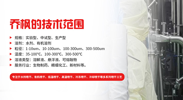 上海喬楓實業有限公司,成立于2012年,是從事噴霧干燥設備的研發設計、生產、銷售(小型噴霧干燥機實驗型噴霧干燥機35℃低溫噴霧干燥機有機溶劑噴霧干燥機低溫閉式循環噴霧干燥機超細粉末噴霧干燥機噴霧冷凍干燥機真空噴霧干燥機氣流噴霧干燥機噴霧造粒干燥機離心噴霧干燥機沸騰制粒機等)和售后于一體的綜合性公司,本公司現成為一家致力于為生物制藥、精細化工、新能源、陶瓷造粒及食品工程等領域提供全套解決方案的整線交鑰匙工程企業。